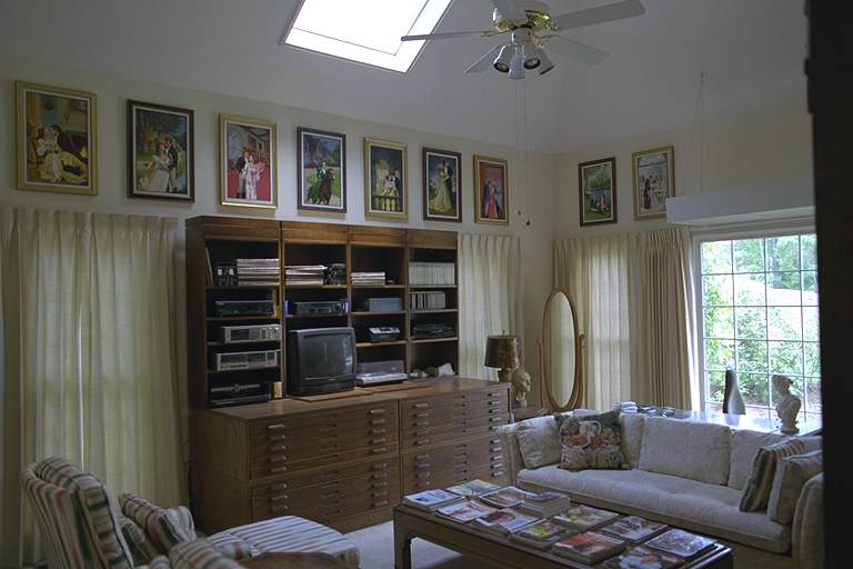 | I've also hung others in a sitting room, the bedrooms, dining room, breakfast room and upstairs hall! As you may have guessed by now, I just like to look at them. Some of my favorites were done in the late seventies and early eighties. They may not be as sexy as later ones, but are very romantic. Three for instance, are Spring of the Tiger by Victoria Holt which hangs over my bed, Wings of the Falcon by Barbara Michaels in a guest bedroom, and Love's Frantic Flight by Joan Joseph in my breakfast room. If you're interested in knowing the titles and authors of the paintings for book covers and collector plates, which I've hung in my house, see Paintings and Plates in My House |