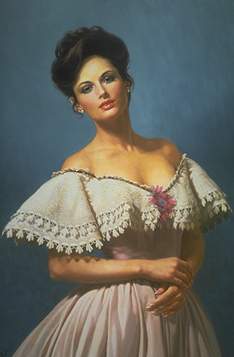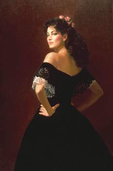 I would have loved to paint the beautiful Carole Gustafson, a sweet and vulnerable girl. Carole posed for one of my favorites, Wings of the Falcon by Barbara Michaels and all of the Catherine series by Julliette Benzoni, which had been a huge best seller in France. She was the heroine of Moon Witch by Felicia Andrews and the angelic looking blonde on Mistress of Martinique by Helene Thornton. I love her pose and facial expression on that one. She was also the redhead on Lady of Fire by Valerie Vayle.