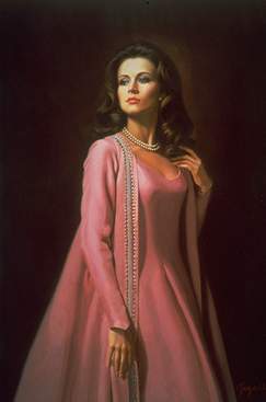 Coco Chanel Although this painting was used for the hard cover book, Coco, the Novel, it actually is a portrait of Chanel, wearing her own designs, a simple wool jersey dress (she was the first to use this fabric which allows so much more freedom of movement) her own jewelry, including her enamel cuff bracelets and hair style with bow. She is seated on one of her famous caramel suede sofas with one of her favorite flower arrangements. Chanel had such courage and originality, she revolutionized the way women dressed, freeing them from corsets and heavily constructed clothing that restricted their movement. Her influence is still strongly felt in what women wear today. |