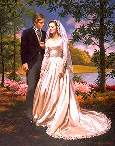 Rob French and Alicia Mann I thought the dress was so beautiful for the cover of Centennial at Jalna, that I decided to do a portrait of the bridal couple in a different setting. I put them in Callaway Gardens, a marvelous place open to the public, here in Georgia. It's a glorious sight in springtime, when the thousands of azaleas, rhododendrons, and dogwood are all in full bloom. |